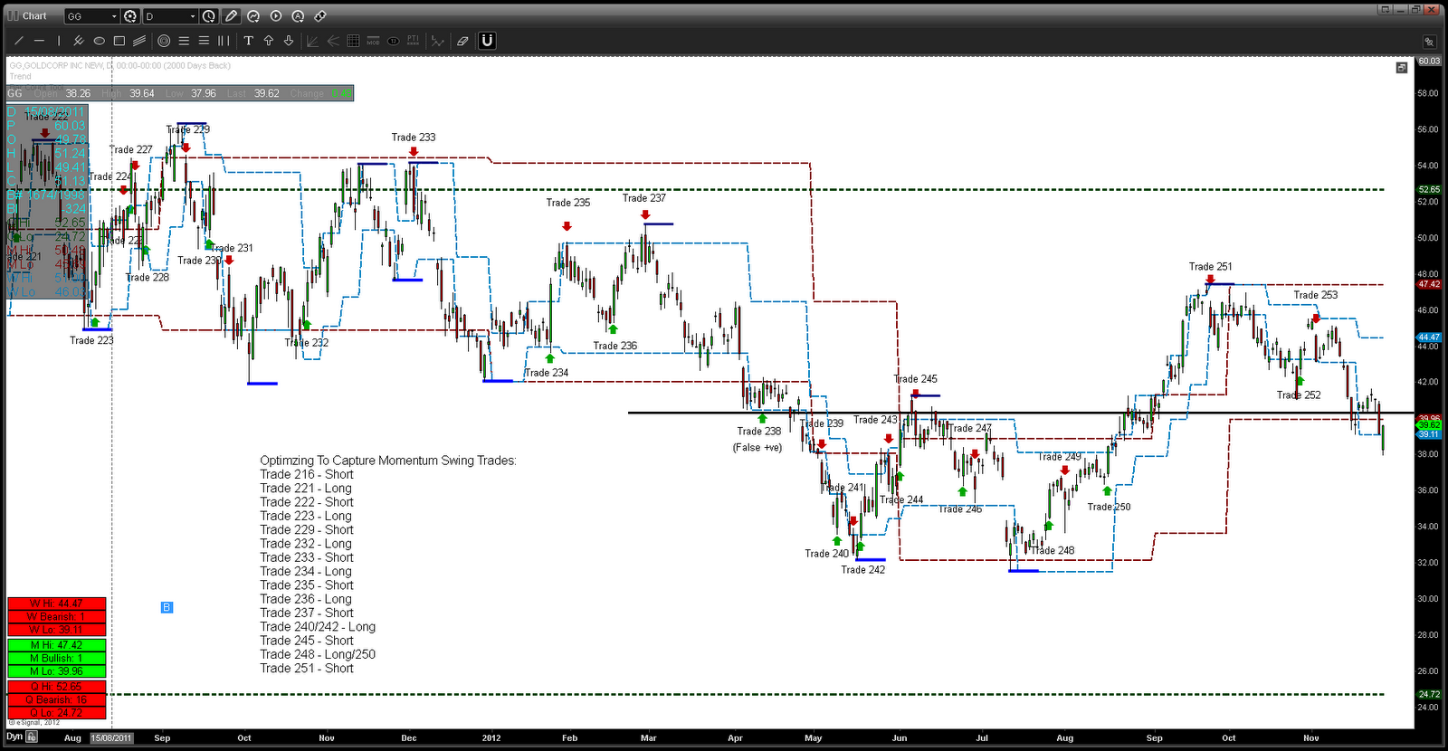 And the Gold trade, which generated an important liquidation signal SE-1714.5 yesterday, which I believe was triggered by the 'Iranian Trade Sanction' - which may prove to be short term noise - as nothing meaningful has happened in the Gold market as of yet. We would need to see the price move < 1713 level and get accepted there. Yesterday, GC tried to go lower and reversed back into the weekly channel (blue lines) in line with the equities trade higher. We saw rising volumes and a wide range day in GC, which would imply some reversion before continuation if this trade is 'true'. Weak action in the Gold would see it break before the end of the week and into December. Gold has been quietly supported in the last 2 months and anything meaningful will take gold outside the weekly range. My stop for GC sits at 1760. I would not be surprised to see gold continue to bounce around the 1755-1713 weekly range. It was interesting to see however, the risk trade come back into the equities yesterday, with a inverse trade in the Gold. Also, the Gold equities have been taken down and have actually disconnected from the metal. I was expecting to see the equities lead the metal lower, earlier in the trade (Short Gold Equities) -- and yesterday we saw a bit of reversion (gold lower, gold equities higher). GG (Goldcorp - NYSE) was taken higher yesterday on a 'Bear Hook' pattern, which has downside risk expectations or implied short trend continuation. See the chart below of GG breaking below the critical 40 threshold. If GG stays < 40, I wouldn't be surprised to see the metal go lower in line with yesterdays signal. Going back over the past 4 years, December is associated with intermediate trend-change for Gold. We should see increasing volatility in gold going forward.